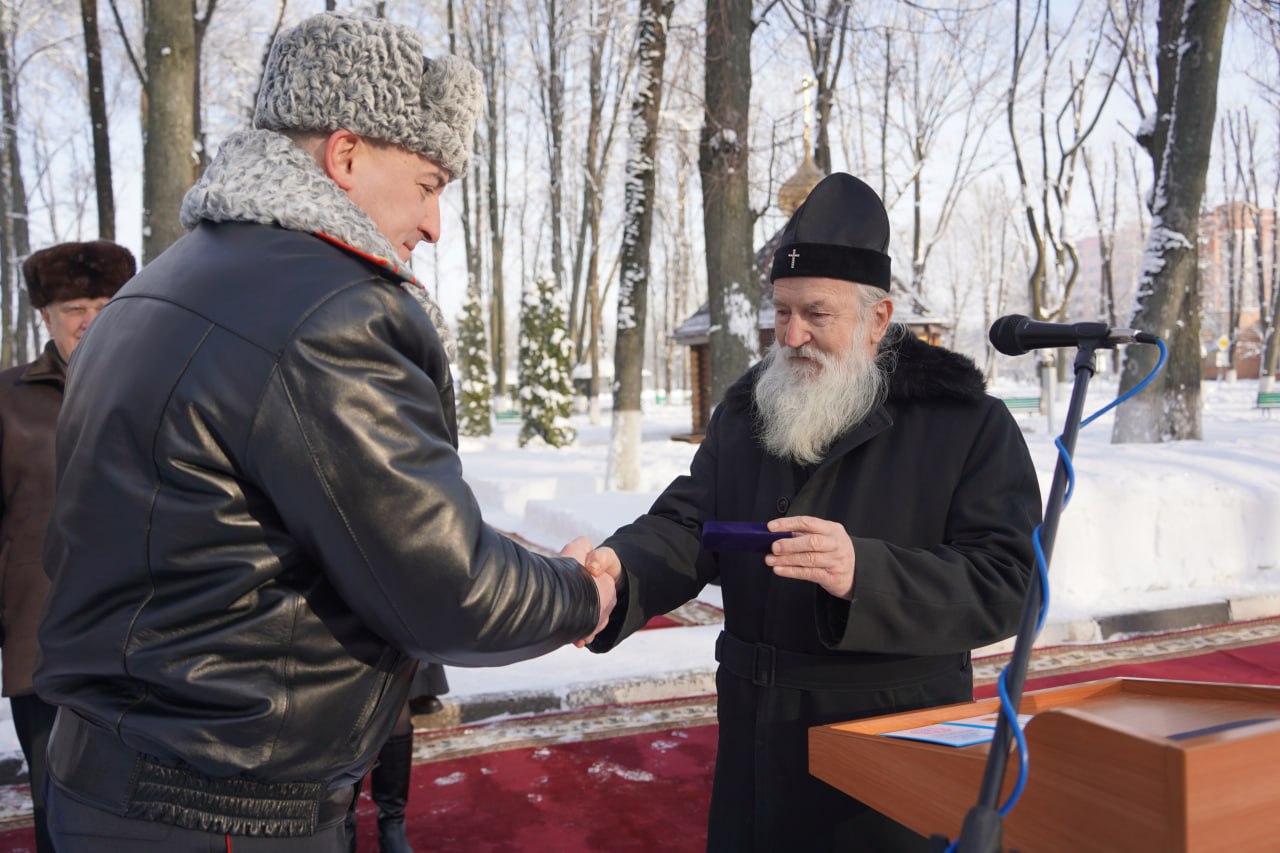 Архиепископ Софроний поздравил всех с праздниками Рождества Христова, Крещения Господня и с совершенным освящением Свято-Александровской часовни. Владыка произнес назидательные слова и поблагодарил тех, кто участвовал в возведении святыни. Полковника милиции Романчука Романа Валерьевича архипастырь наградил медалью святого мученика Иоанна Воина.